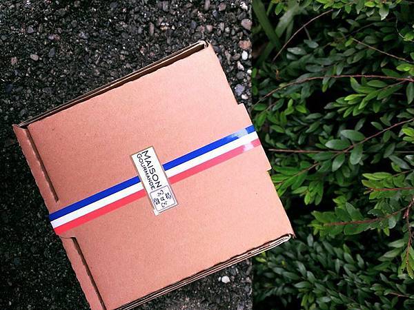 包裝的牛皮紙盒用著紅藍色貼紙貼著,好有異國情調,