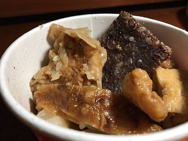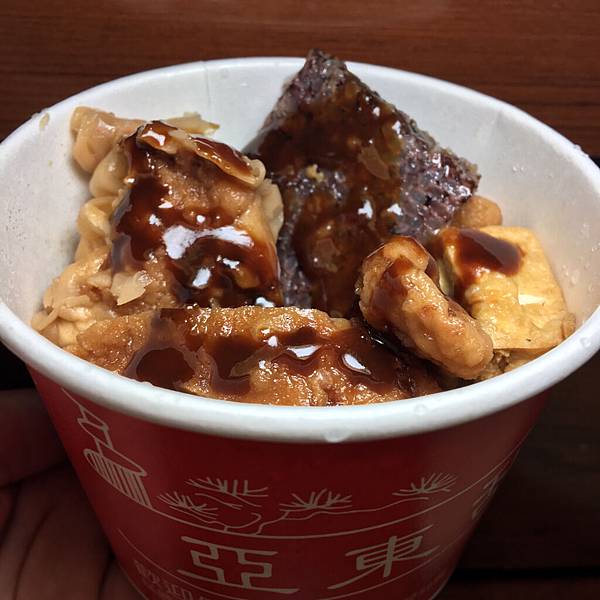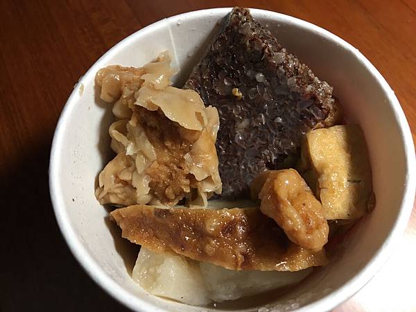 綜合款可以吃到油豆腐、條狀甜不辣、片狀甜不辣、白蘿蔔、豬血糕、還有吃起來像雞卷的炸餛飩(?