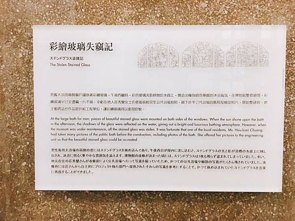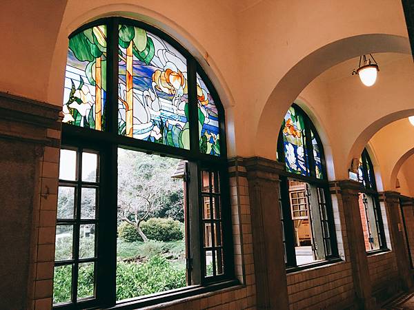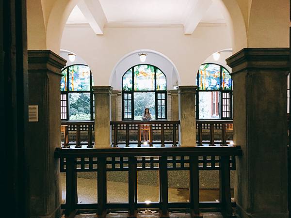 北投溫泉博物館依山坡而建,往下樓梯則是一樓大浴場。館內有著透亮採光,英國鄉村別墅風格的玻璃窗讓公共浴場增添西洋味;不過,這般精緻裝飾也曾發生「玻璃失竊記」,窗戶炫麗玻璃在整修期間遭竊,所幸有照片為輔依樣重現當年。