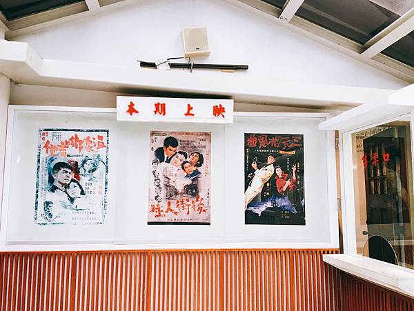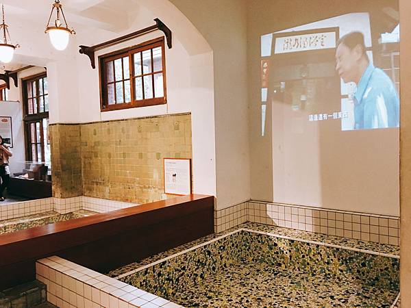 北投溫泉博物館入口處為二樓,以寬敞榻榻米為中央,面對主廳右側是迴廊風景,後方是解說展覽室;左側是播有復古電影的放映室,「本期上映」字樣下貼有老年代的電影海報。