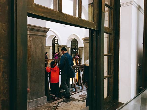 白牆與紅磚牆面,在茂綠樹叢中特別顯眼。循著排隊路線,褪去鞋履更換拖鞋,明亮的迴廊景色一眼就讓我著迷,一旁的北投圖書館成為眼前一幅畫中的素材。